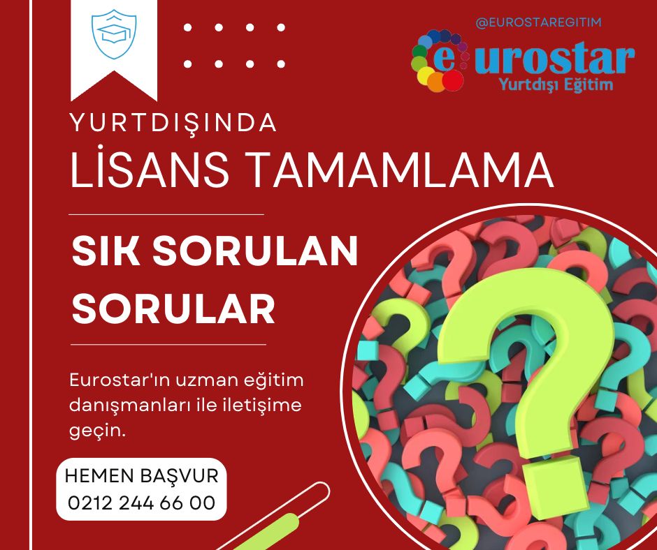 Farklı birçok ülke ile bağlantısı bulunan firma sayesinde geleceğe güvenle adım atmak sizin elinizde. İyi bir gelecek için Eurostar yurtdışı eğitim danışmanlığı ile görüşme yapabilirsiniz. Eğitim süresi boyunca desteğini her daim öğrencilerden esirgemeyen kurum iş bulma ve dil eğitimi gibi hizmetler de vererek profesyonel yardım sağlamaktadır. Alacağınız kaliteli ve prestijli eğitim sayesinde iki yıllık ön lisans diplomanızı 4 yıllık lisans diplomasına dönüştürebilirsiniz. Öğrencilerden gelen taleplere göre hareket eden firma ihtiyaçlara yönelik tüm hizmetleri sunmaktadır. Önlisans diploması ile kalmak istemeyenler dikey geçiş-lisans tamamlama imkanından yararlanarak geleceğini en iyi şekilde şekillendirebilirler. Özlem duyduğunuz üniversite hayatı parmaklarınızın ucunda yatıyor.
