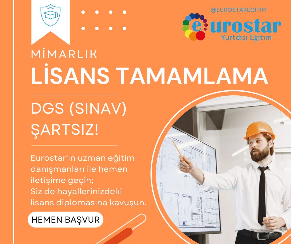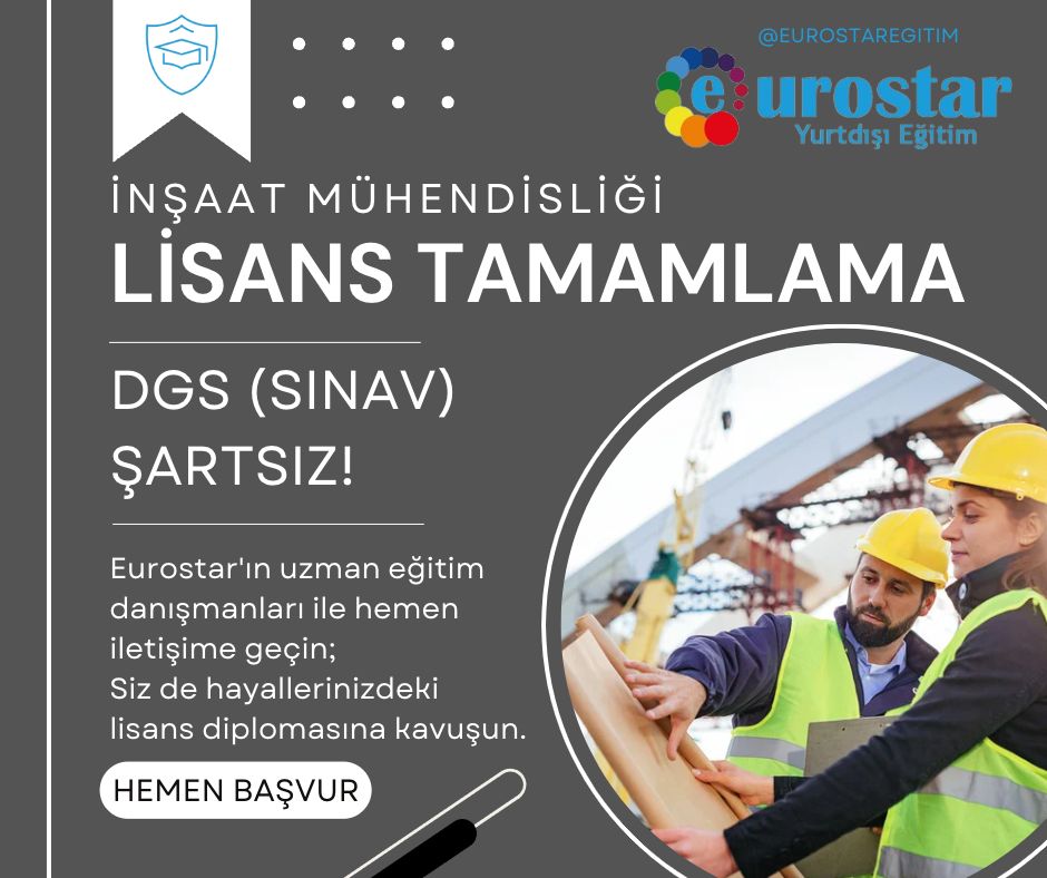 2 yıllık inşaat teknisyenliği yada teknikerliği bölümünden mezun olan öğrenciler yurtdışında lisans tamamlama geçiş yaparak inşaat mühendisliği bölümünde eğitimlerini tamamlayabilirler. Yurtdışı imkanlarından yararlanmak ve en iyi şartlarda lisans eğitiminize devam etmek istiyorsanız yapmanız gereken çok basit. Üniversite seçiminizi yaparak başvuru için Eurostar yurtdışı eğitim danışmanlığı ofislerini ziyaret edebilirsiniz. Tüm hizmetleri kusursuz olarak öğrencilerin ayağına getiren firma sayesinde başvuru işlemlerinizi sorunsuz bir şekilde gerçekleştirebilirsiniz. Akademik kariyerinize iyi bir üniversitede devam etmek ve tam donanımlı olarak en iyi ortamda eğitim görmek istiyorsanız inşaat teknikerliği lisans tamamlama programından siz de yararlanabilirsiniz. Stres yaşamadan dgsye girmeden eşit koşullarda lisans tamamlama fırsatından yararlanabilirsiniz. Dgs siz lisans tamamlama mümkündür.